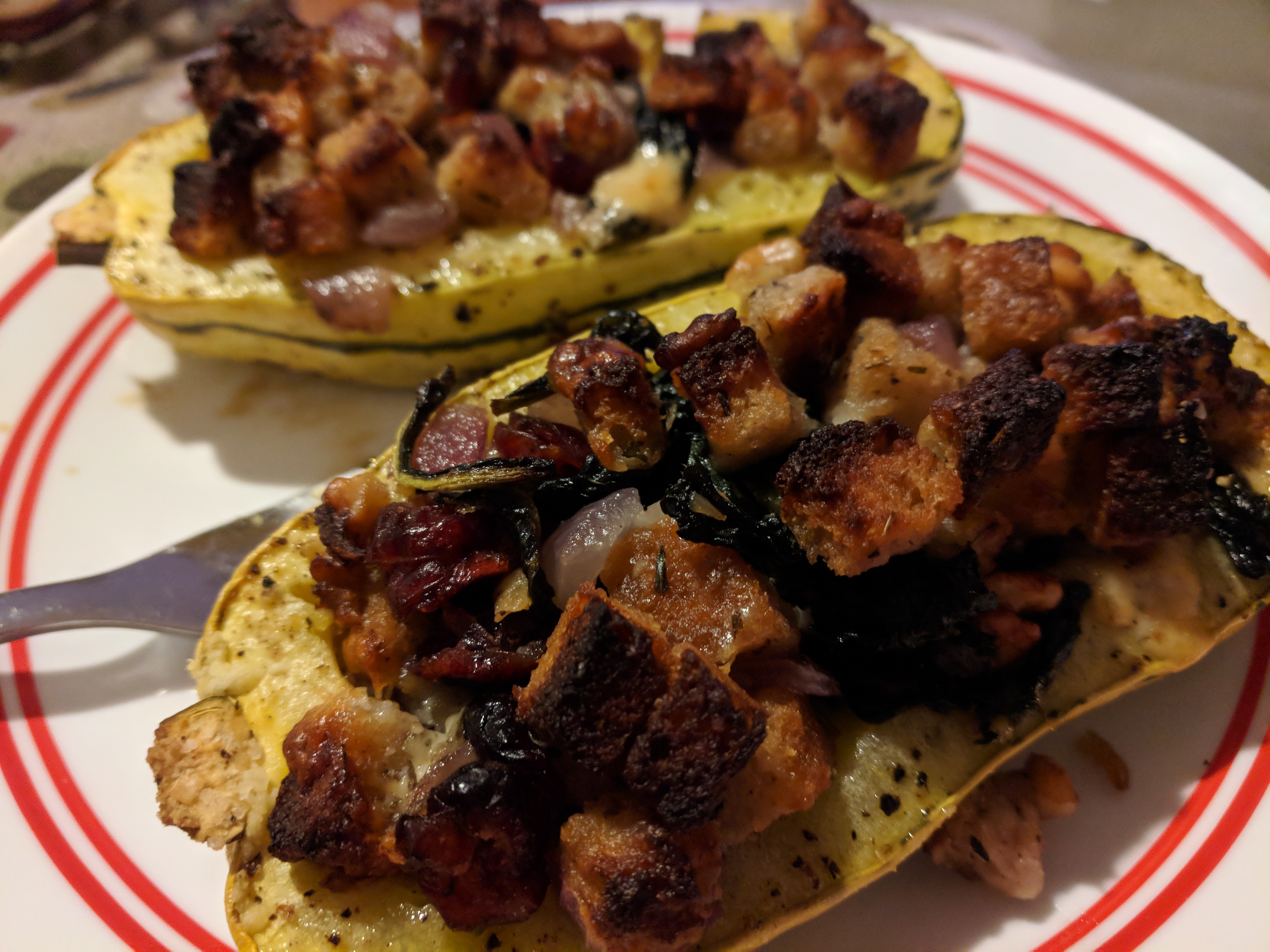 When I first saw the delicata squash this week, I was a bit intimidated. I had never cooked them before and honestly thought they might just be ornamental because of the colorful striping. After a little googling I realized that they are the perfect vessel for a flavorful stuffing and that they can be eaten whole, skin and all. The recipe I started with came from NY Times Cooking and was called Whole-Roasted Stuffed Delicata Squash. I made some modifications based on what I had on hand (i.e. I subbed arugula for the kale) and it came out great. Here’s what I did… I sliced the squash in half length-wise and scraped out the seeds. I sprayed them with cooking spray and sprinkled them with salt and pepper. While I worked on the stuffing, I gave them a fifteen minute head start in a 400 degree oven. For the stuffing, I started by toasting walnuts in a dry skillet and removing them to a large bowl. Next, I sauteed chopped onion and garlic until soft and added arugula until it wilted and cooked down. I dumped the veggies into the bowl. Then I added stuffing cubes from the pantry (you could make your own from stale or toasted bread) to the pan with a few tablespoons of butter, tossing constantly to coat and lightly brown. I added the cubes, dried cranberries and dried herbs to the bowl and mixed to combine. To help bring the mixture together, I added a few tablespoons of chicken broth (I skipped the maple syrup the recipe calls for so needed some moisture). Once it cooled a bit, I stirred in blue cheese crumbles. Finally, I added the stuffing to the parcooked squash, mounding it high and pushing it into the squash. I cooked it for about twenty minutes before covering with foil to prevent the stuffing from burning and then added about ten minutes more until the squash was fork-tender. The squash was flavorful, the stuffing crunchy and it made for a great introduction to a new vegetable! I couldn’t help but snapping a picture: